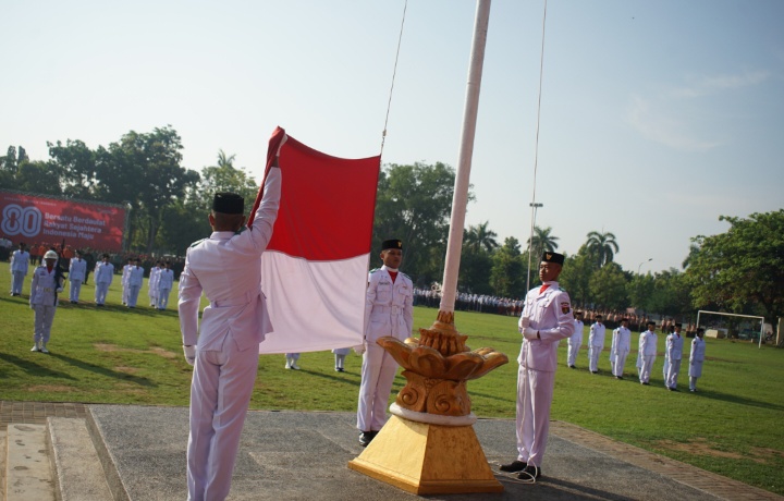 Upacara berlangsung dengan penuh khidmat saat bendera Merah Putih dikibarkan oleh Pasukan Pengibar Bendera Pusaka (Paskibraka). Prosesi pengibaran diiringi lagu kebangsaan Indonesia Raya dan lagu-lagu nasional lainnya yang menambah suasana haru dan meriah.
