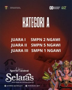 Setelah melalui proses penilaian yang ketat, dewan juri menetapkan daftar juara Ngawi Specta Carnival 2025 pada tiga kategori, yaitu SMP/MTs sederajat, SMA/SMK/MA sederajat, serta kategori umum.